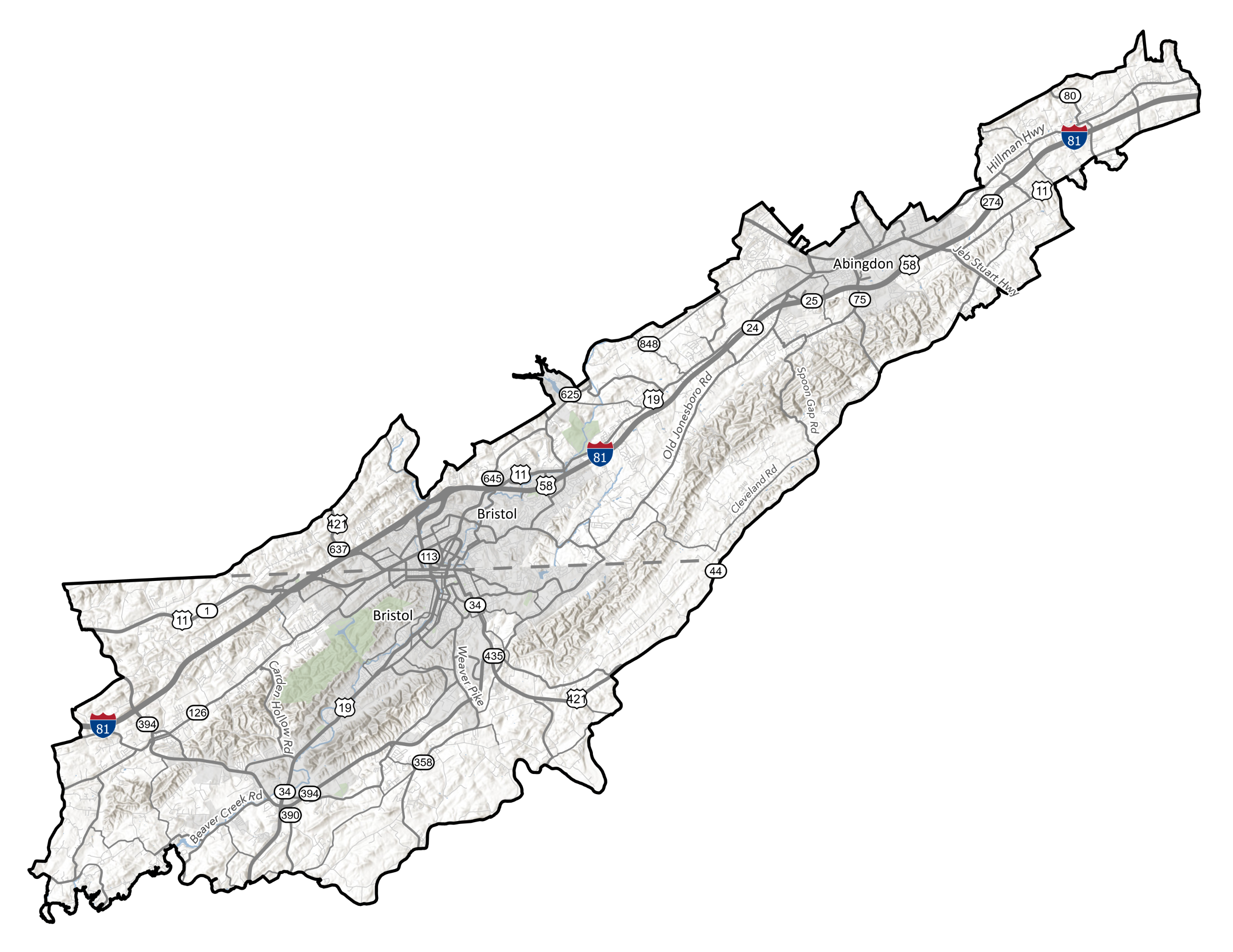 The Bristol Metropolitan Planning Organization (MPO) straddles the Tennessee/Virginia border and is comprised of five jurisdictions: the City of Bristol, TN, the City of Bristol, VA, Abingdon, VA, parts of Sullivan County, TN, and parts of Washington County, VA. The Bristol MPO is part of the larger Tri-Cities region which also includes Kingsport, TN and Johnson City, TN. It is shown in the following map. For an even closer link, head to the About Us section of the MPO supplement.